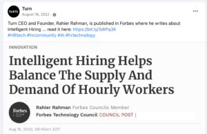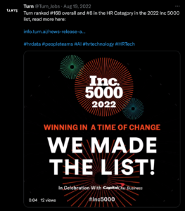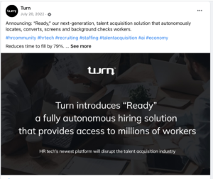 Turn AI is a venture-backed tech startup focused on the HR industry with a B2B platform for predictive modeling and operational efficiencies. At Turn, I wore several hats and produced varied brand-centric content from video to a website overhaul, public relations and thought leadership campaigns, social media management, product one-sheets and demand generation campaigns.