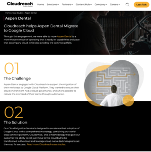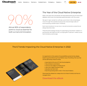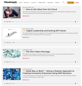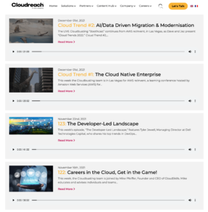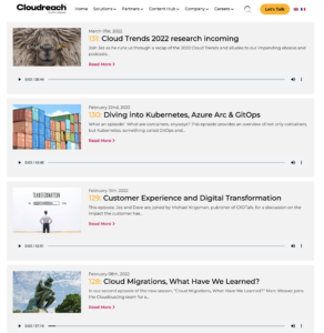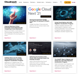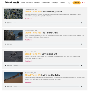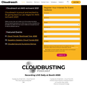 At the time, Cloudreach was the largest independent cloud consultancy focused on public cloud services with AWS, Google and Azure. Upon my hiring, the Global Digital Marketing Director resigned, leaving me to take over Web Development and SEO, Social Media, Influencer Marketing and liaison with Marketing Operations on-site translation and Marketo transition projects. In the meantime, I owned content strategy. I created an editorial calendar to produce a staggering amount of content, including 25 podcasts and over 25 combined web pages, landing pages, case studies and reports.