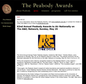 The International Peabody Award, administered by the Grady College of Journalism and Mass Communications, recognizes excellence in electronic media. In this role, I developed an in-house agency that created all program content for advertising, marketing and public relations. More to come here: I have two documentary video productions, two websites, four booklets, plus a lot of ad copy and designs featured in Variety and Hollywood Reporter.